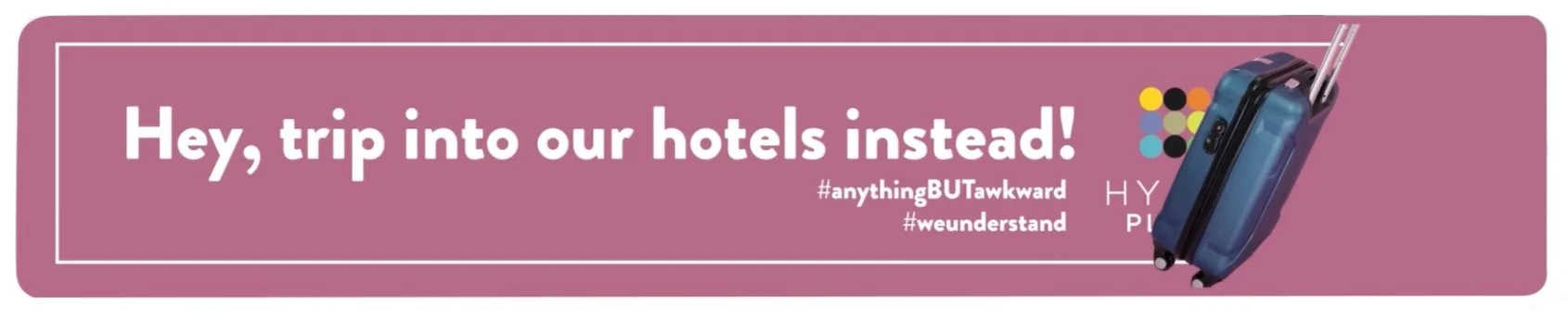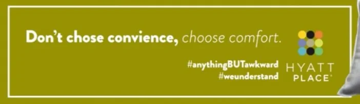 Yikes, traveling alone for the first time? Not to worry- Hyatt Place is the place for you. The Anything but Awkward campaign is designed to give solo traveling consumers a welcoming and comforting environment. By utilizing various traveling imagery within airports and hotels, the ads use humorous, relatable copy that aims to connect with consumers. To enhance buzz and overall experience, advertisements were carefully placed throughout the airport and hotel, utilizing a QR to allow travelers to seamlessly book online. This overall purpose? Say goodbye to those solo travel jitters and say hello to a smooth and enjoyable stay at Hyatt Place.